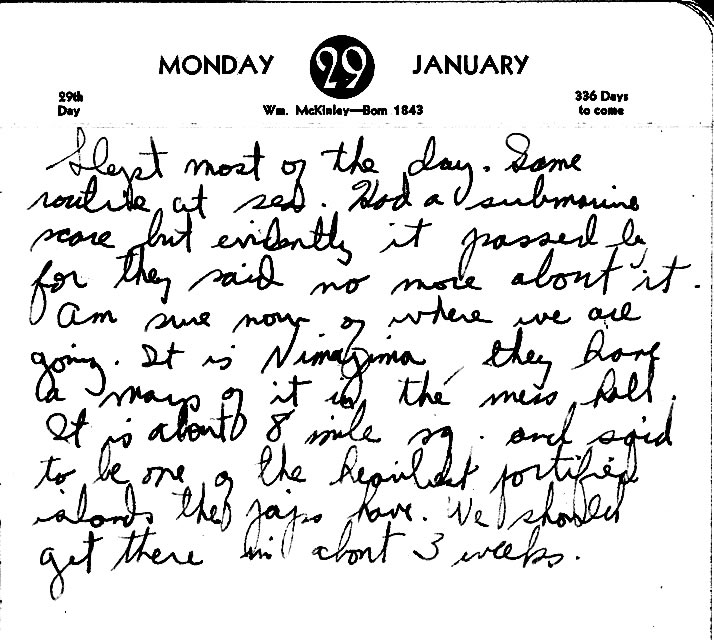 Saturday, Jan. 27 We left Honolulu today at 10:30 A.M. Went out of the harbor and then joined up with our task force off the island. Had firing practice this afternoon and also simulated air attacks. Am standing watches up in the flag plot now. The flag navigator told us today that we are going to Eniwetok, be there a week from today, then on to Siapan which will take another week. Very calm sea out, but plenty hot. Sunday, Jan. 28 Still at sea, not much doing. We are only having GQ in the mornings now, not at night. Am standing one watch on and two off. Monday, Jan. 29 Slept most of the day. Same routine at sea. Had a submarine scare but evidently it passed by for they said no more about it. Am sure now of where we are going. It is Nimajima (Iwo Jima), they have a map of it in the mess hall. It is about 8 mile sq. and said to be one of the heaviest fortified islands the Japs have. We should get there in about 3 weeks. Tuesday, Jan. 30 Had another sub scare about 10:00 last night. But nothing more was heard of it. They think they intercepted enemy sub radar transmissions. Also a destroyer in our screen picked up a life raft but no signs of life or identification. A little cloudy today. Wednesday, Jan. 31 to Saturday, Feb. 3 At sea. Sunday, Feb. 4 Had a submarine scare again, as we have had several during the past few days. A Destroyer Escort was detached from our screen and sent out to investigate sonar hearings. Made ten runs on sub, then had terrific explosion, but unable to tell whether it sunk it or not. We also received warnings of midget submarines in vicinity and to be on a special alert for them. Had a PBM flying boat out to patrol us in. Have found out that we are now about 1440 miles from Iwo Jima, island of invasion. It is supposed to come off Feb. 19, at 9:00 A.M. We are due in Saipan on the 11th, maneuvers till the 13th or so. It is 600 miles from Saipan to "it".